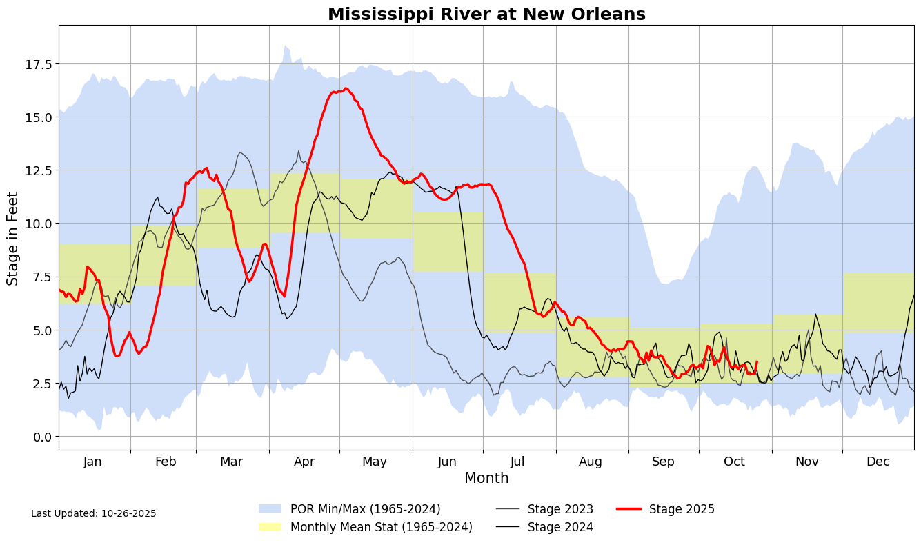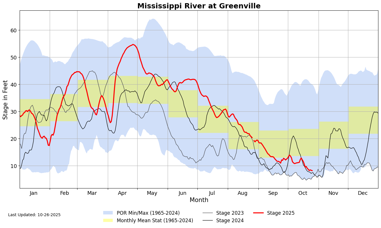 Each hydrograph shows river stages (in feet) for this year to date compared to recent past years and record minimum/maximum levels for that location (since 1965).